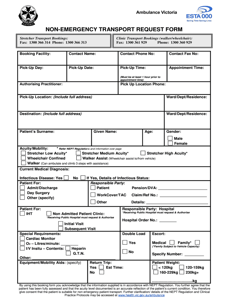 Get the free NONEMERGENCY TRANSPORT REQUEST FORM Stretcher Transport Bookings: Fax: 1300 366 314 ...