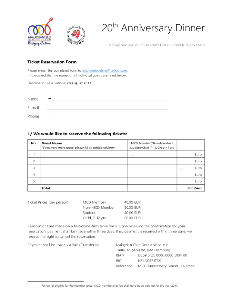 20th Anniversary Dinner 02 September 2017 Marriott Hotel Frankfurt am Nantucket Reservation Form Please email the completed form to MCD. Deutschland yahoo.com. It is required that the names of all