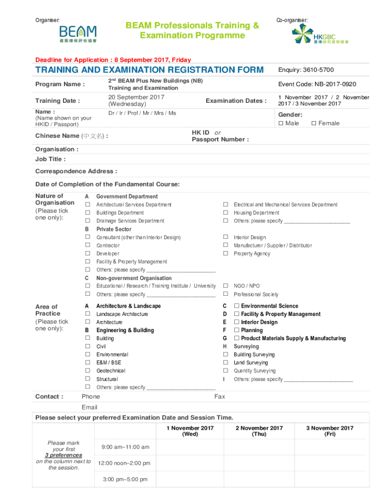 Organizer:BEAM Professionals Training & Examination ProgrammeCoorganiser:Deadline for Application : 8 September 2017, FridayTRAINING AND EXAMINATION REGISTRATION FORM Program Name :2nd BEAM Plus New