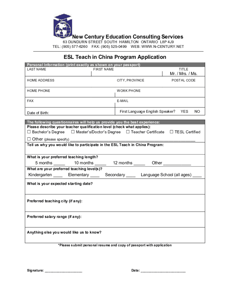 TEL: (905) 5776260 FAX: (905) 5250499 WEB: WWW.CENTURY.NE TESL Teach in China Program Application