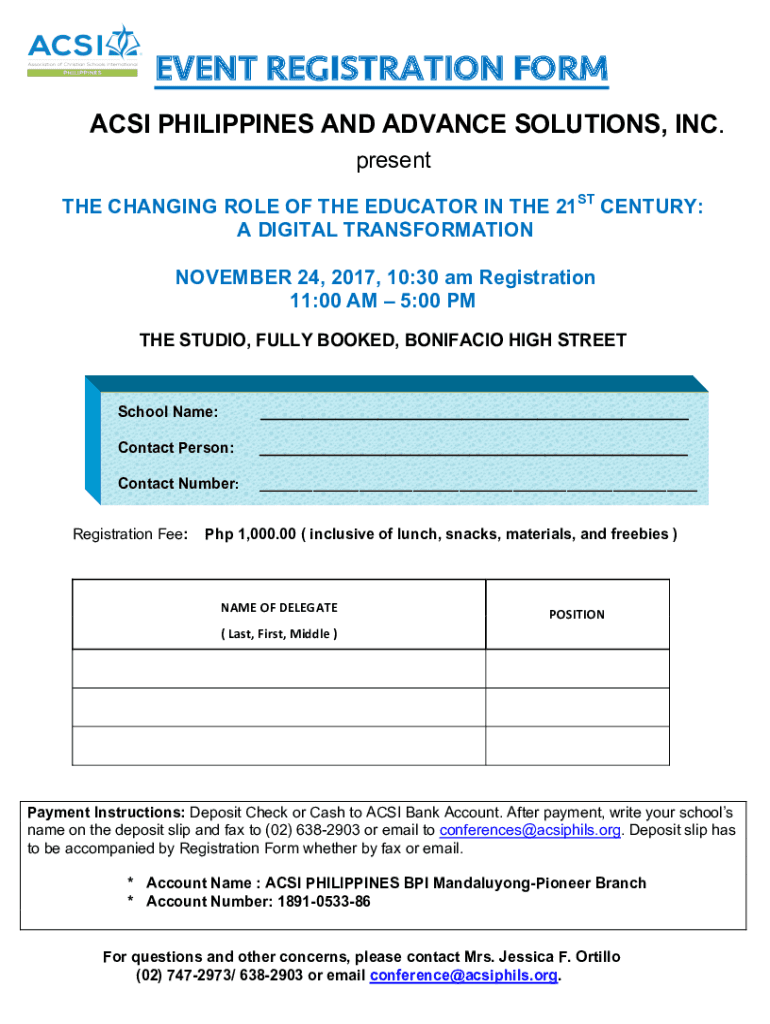 EVENT REGISTRATION FORM ACS PHILIPPINES AND ADVANCE SOLUTIONS, INC. present THE CHANGING ROLE OF THE EDUCATOR IN THE 21ST CENTURY: A DIGITAL TRANSFORMATION NOVEMBER 24, 2017, 10:30 am Registration