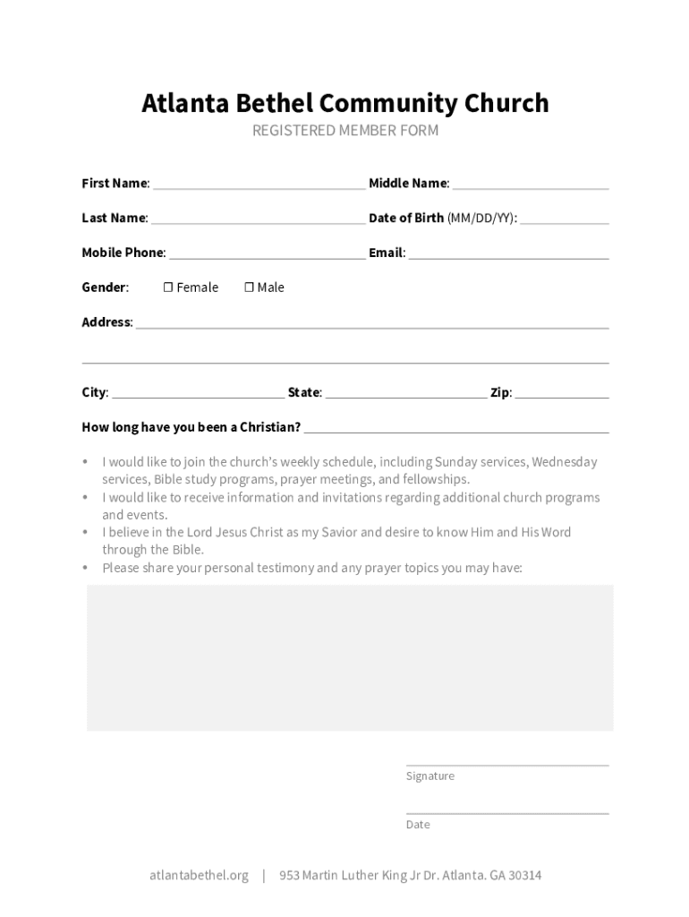 Atlanta Ethel Community Church REGISTERED MEMBER Formalist Name:Middle Name:Last Name:Date of Birth (MM/DD/BY):Mobile Phone:Email:Gender: Female Headdress:City:State:Zip:How long have you been a Christian?