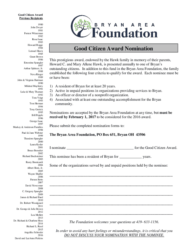 Good Citizen Award Previous Recipients 1980 John Dwyer 1981 Forrest Waterman 1982 Rosa Isaac 1983 Howard Rogue 1984 Lemuel Hawk 1985 Grant Brown 1986 Ernestine Spangler 1987 Arthur Splatter, Jr. 1988