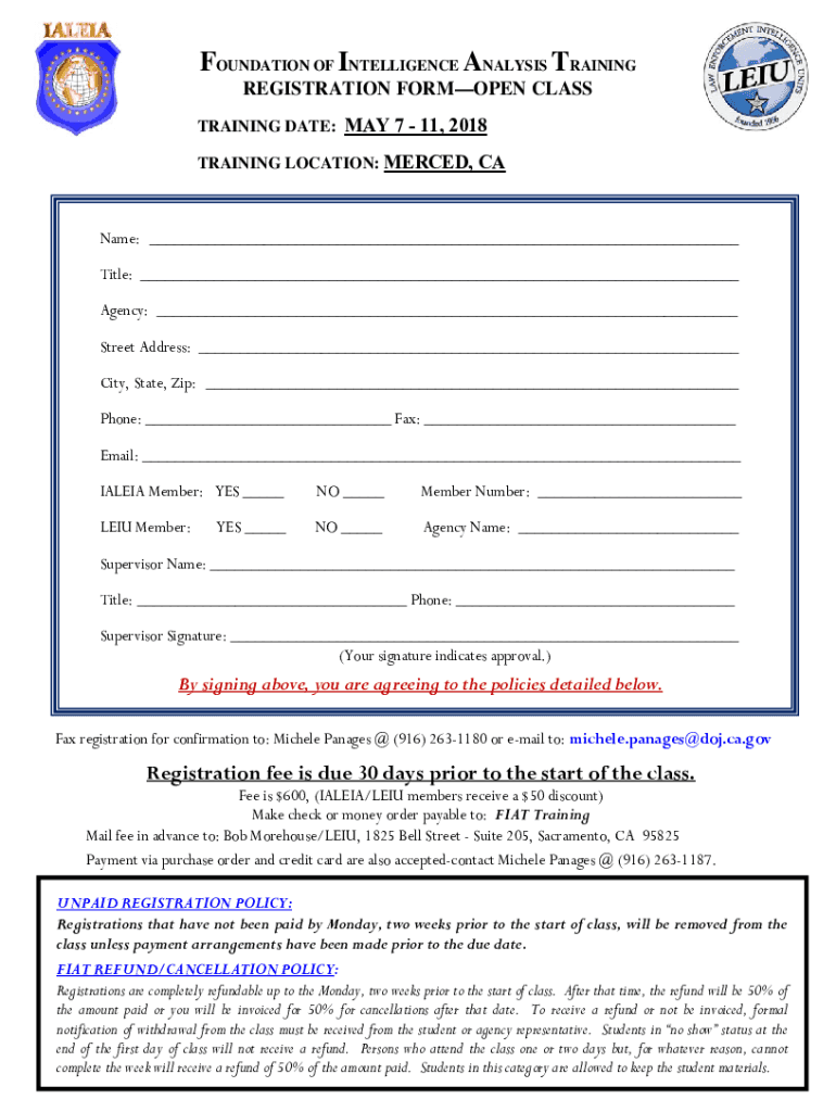 FOUNDATION OF INTELLIGENCE ANALYSIS TRAINING REGISTRATION FORMOSAN CLASS TRAINING DATE: MAY 7 11, 2018 TRAINING LOCATION: MERCED, Canapé: Title: Agency: Street Address: City, State, Zip: Phone: Fax:
