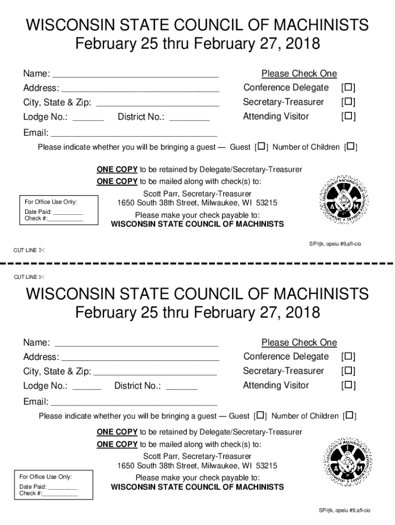 WISCONSIN STATE COUNCIL OF MACHINISTS February 25 through February 27, 2018, Name: Address: Please Check One Conference Delegate City, State & Zip:SecretaryTreasurer Attending Visitor Lodge No.: District