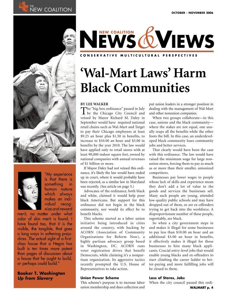 OCTOBER – NOVEMBER 2006 NEWS VIEWS NEW COALITION C O N S E R V A T I V E M U L T I C U L T U R A L P E R S P E C T I V E S Walmart Laws' Harm Black Communities BY LEE WALKER he big-boordinalan e”