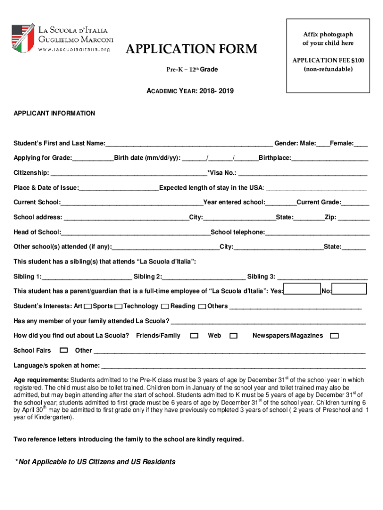 Affix photograph of your child reapplication FORMALIZATION FEE $100 (nonrefundable)Prey 12th GradeACADEMIC YEAR: 2018 2019 APPLICANT INFORMATIONStudents First and Last Name: Gender: Male: Female: