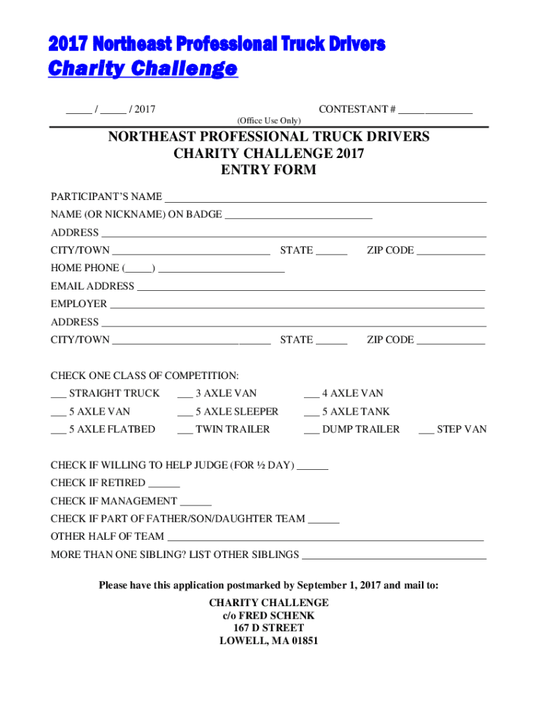 2017 Northeast Professional Truck Drivers Charity Challenge / / 2017CONTESTANT # (Office Use Only)NORTHEAST PROFESSIONAL TRUCK DRIVERS CHARITY CHALLENGE 2017 ENTRY FORM PARTICIPANTS NAME (OR NICKNAME)