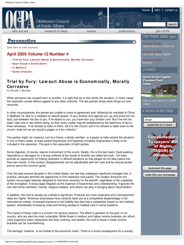 Oklahoma Council of Public Affairs search posted 4.27.2005 Click here to view archives April 2005 Volume 12 Number 4 Trial by Fury: Lawsuit Abuse is Economically, Morally Corrosive Open House a Grand