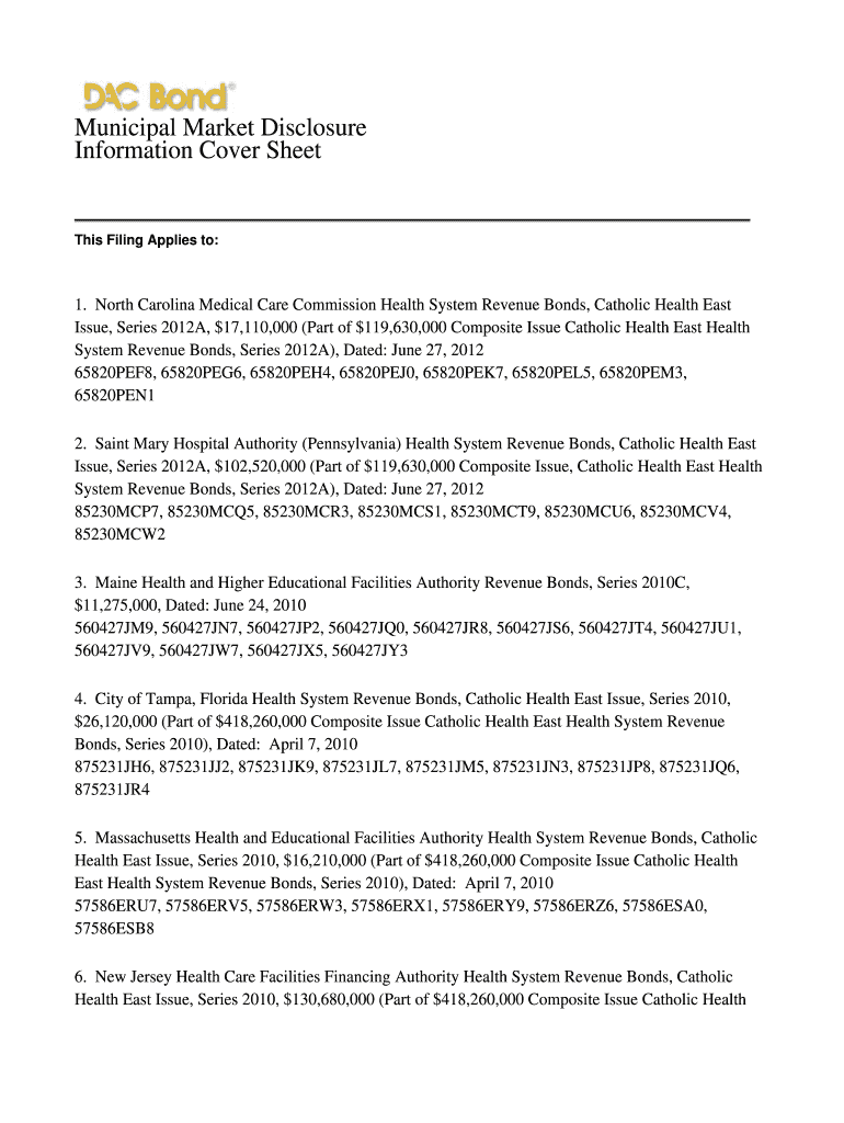 Municipal Market Disclosure Information Cover Sheet This Filing Applies to: 1. North Carolina Medical Care Commission Health System Revenue Bonds, Catholic Health East Issue, Series 2012A, $17,110,000