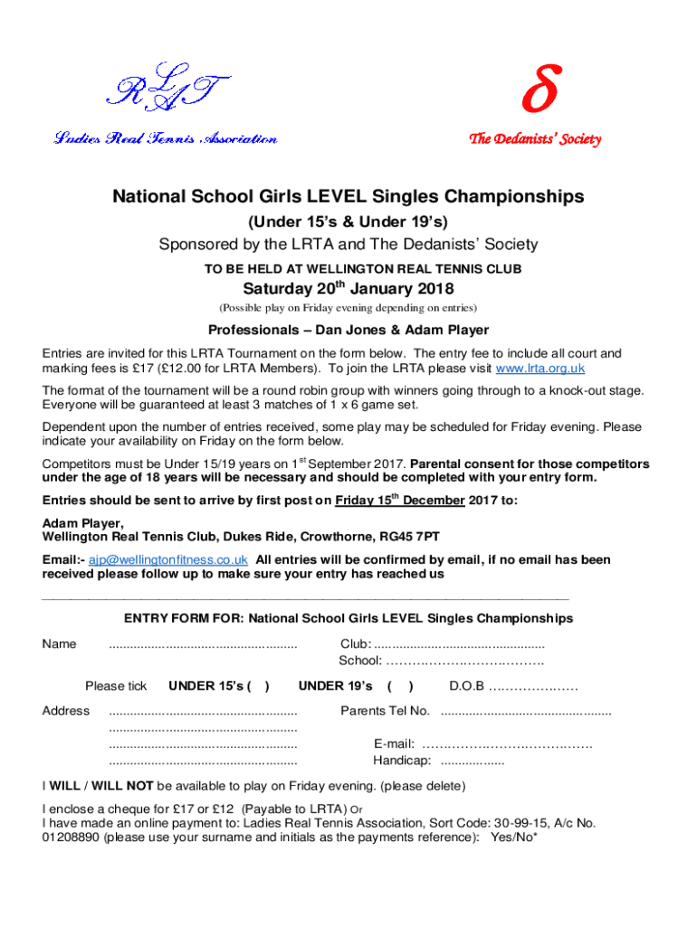 The Medalists SocietyNational School Girls LEVEL Singles Championships (Under 15s & Under 19s) Sponsored by the RTA and The Medalists Society TO BE HELD AT WELLINGTON REAL TENNIS CLUB Saturday 20th