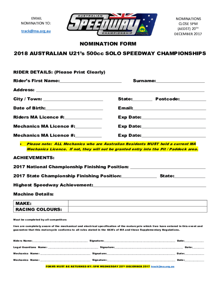 Get the free NOMINATION FORM 2018 AUSTRALIAN U21 s 500cc SOLO SPEEDWAY ...