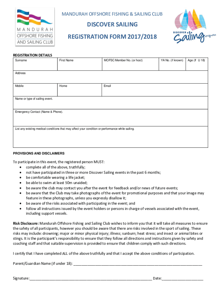 MANDURAH OFFSHORE FISHING & SAILING CO-DISCOVER SAILING REGISTRATION FORM 2017/2018 REGISTRATION DETAILS SurnameFirst NameMOFSC Member No. (or host)HomeEmailYA No. (if known)Age (If U 18)AddressMobileName