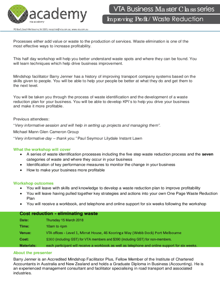 PO Box 5, South Melbourne, Vic 3205; reception@vta.com.au; www.vta.com.auProcesses either add value or waste to the production of services. Waste elimination is one