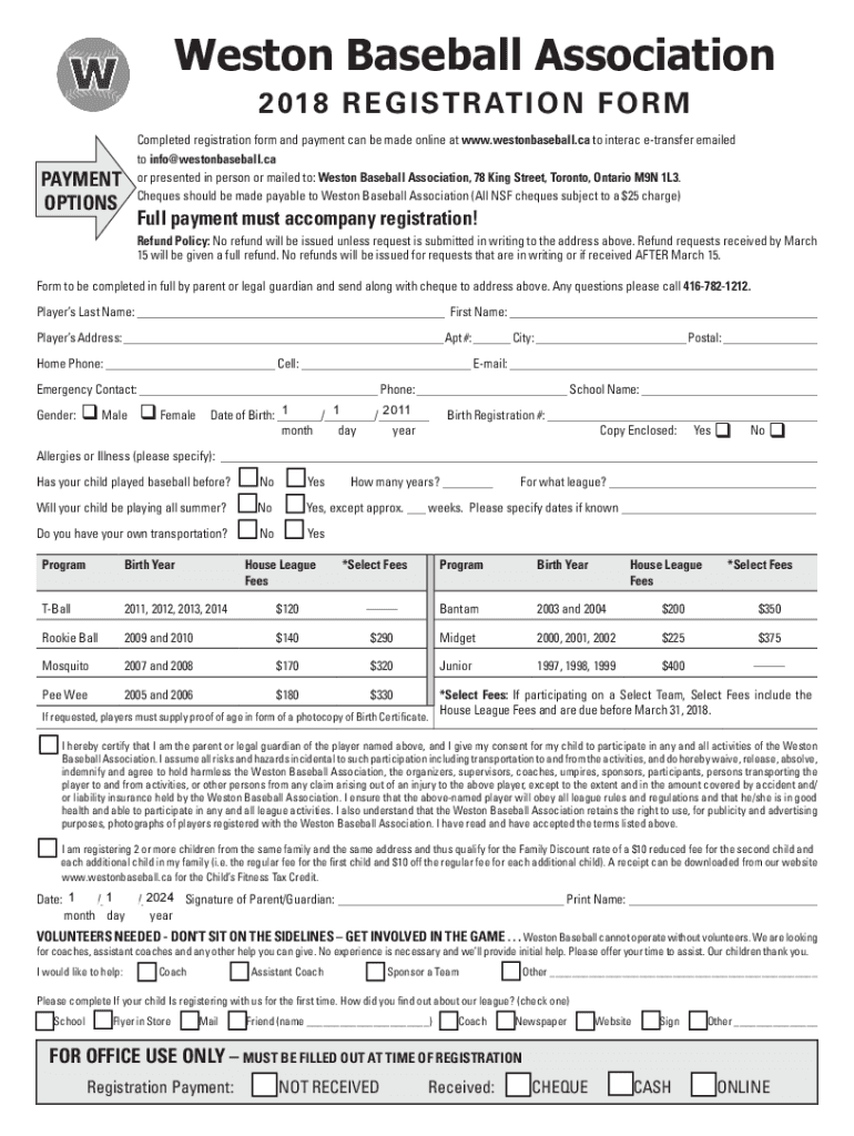 Completed registration form and payment can be made online at www.westonbaseball.ca to interact transfer emailed