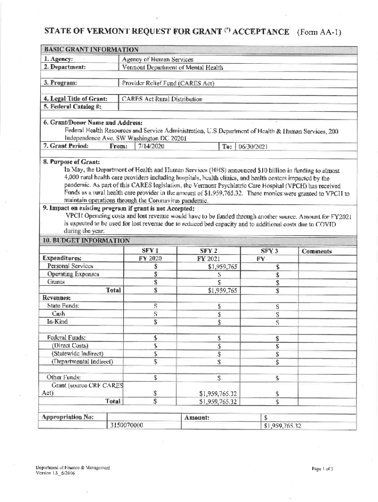 STATE OF VERMONT REQUEST FOR GRANT 1. Agency:2. Department:Agency of Human Services Vermont Department of Mental Health3Provider Relief Fund4. Legal Title of Grant:CARES Act Rural Distribution(.)ACCEPTANCE