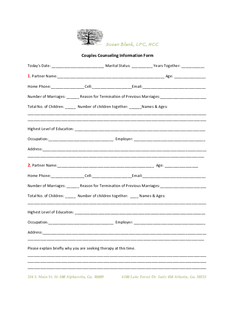 Susan Blank, LPC, Couples Counseling Information Formosa's Date: Marital Status: Years Together: 1. Partner Name: Age: Home Phone: Cell: Email: Number of Marriages: Reason for Termination of Previous