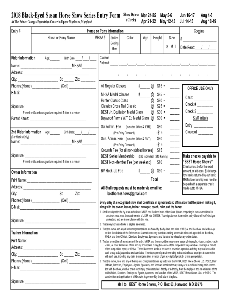 2018 Blackened Susan Horse Show Series Entry Form At The Prince Georges Equestrian Center in Upper Marlboro, Marylander # Horse or Pony Name Show Dates: Mar 2425 (Circle) Apr 2122Horse or Pony Information