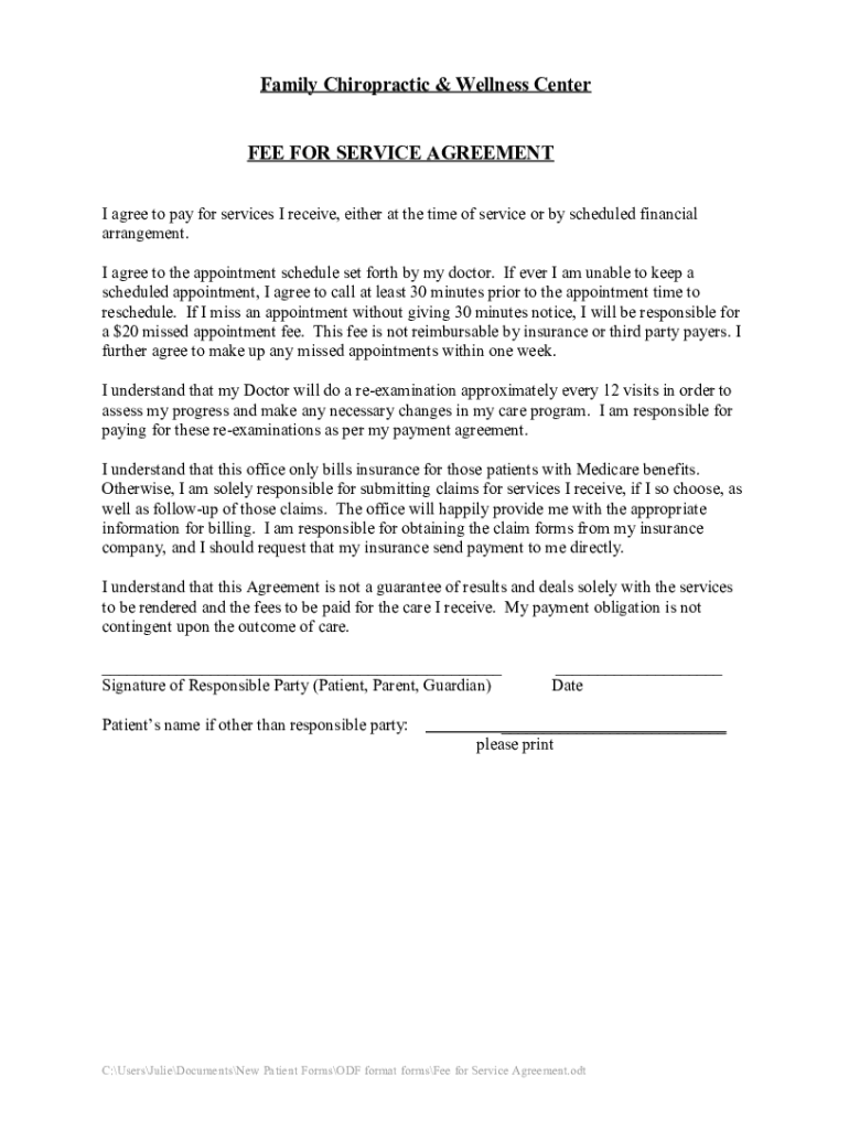 Family Chiropractic & Wellness Center FEE FOR SERVICE AGREEMENT I agree to pay for services I receive, either at the time of service or by scheduled financial arrangement. I agree to the appointment