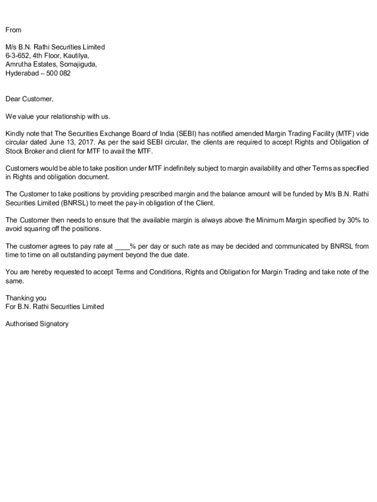 From M/s B.N. Rat hi Securities Limited 63652, 4th Floor, Hastily, Amrita Estates, Somajiguda, Hyderabad 500 082Dear Customer, We value your relationship with us. Kindly note that The Securities Exchange