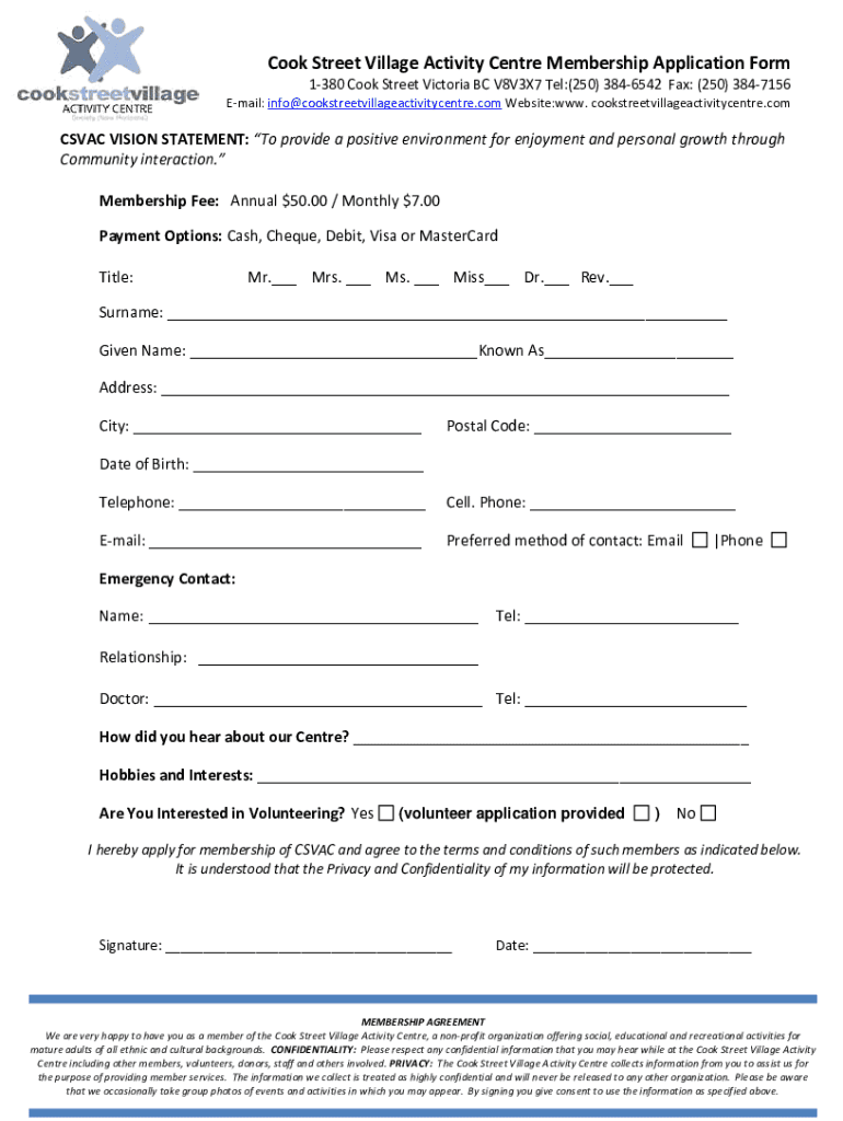 Cook Street Village Activity Center Membership Application Form 1380 Cook Street Victoria BC V8V3X7 Tel:(250) 3846542 Fax: (250) 3847156 Email: info cookstreetvillageactivitycentre.com Website:WWW.