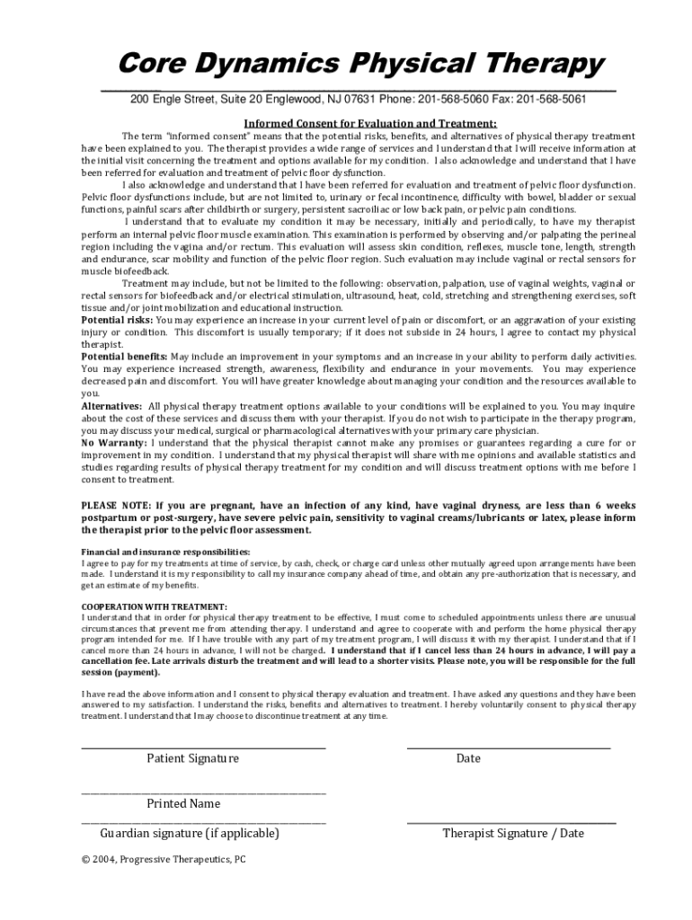 Core Dynamics Physical Therapy 200 Angle Street, Suite 20 Englewood, NJ 07631 Phone: 2015685060 Fax: 2015685061 Informed Consent for Evaluation and Treatment: The term informed consent means that