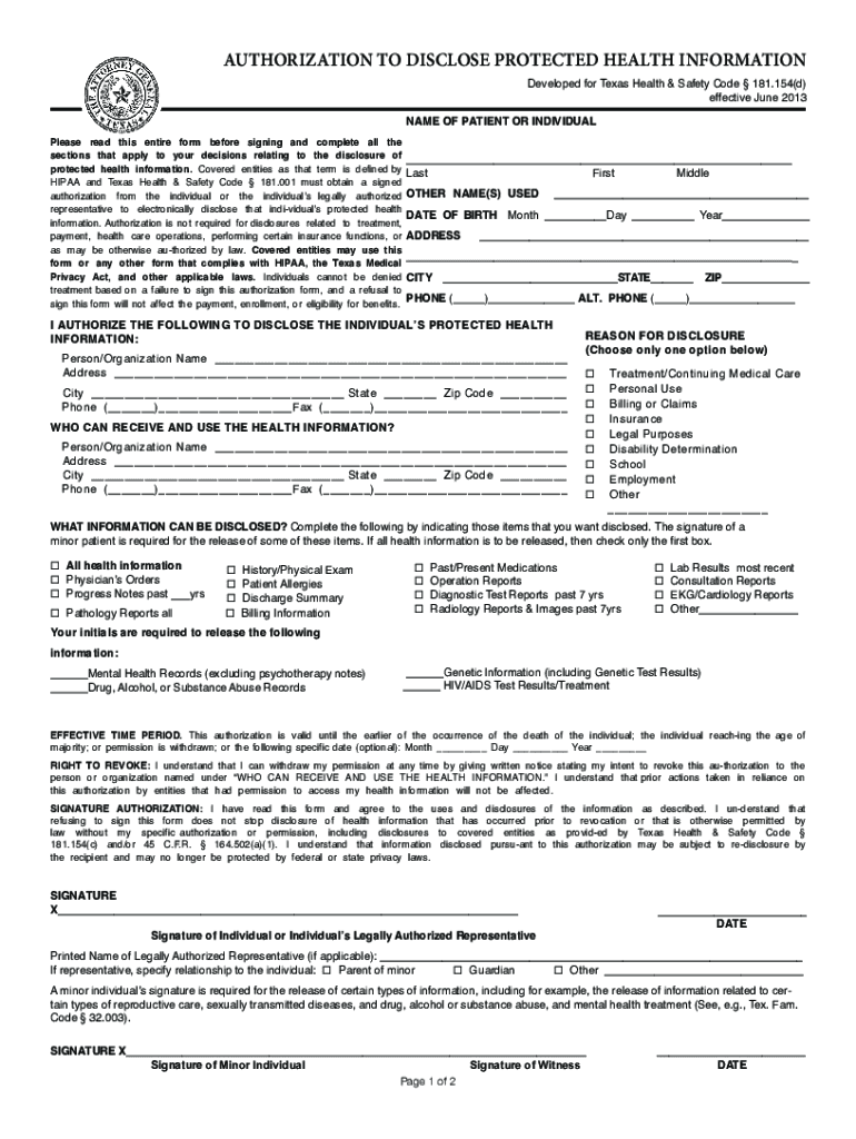 AUTHORIZATION TO DISCLOSE PROTECTED HEALTH INFORMATION Developed for Texas Health & Safety Code 181.154(d) effective June 2013NAME OF PATIENT OR INDIVIDUAL Please read this entire form before signing