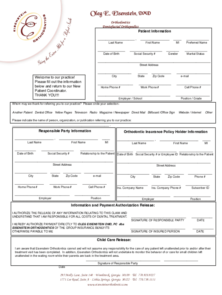Egg Z Limb aZ3OHJ))LVHQVWHLQ, (1 (Orthodontics Dentofacial Orthopedics Patient Information AZ d GV, Last Name : Z i d c Date of Birth First Name Social Security # MI Gender Preferred Name Marital