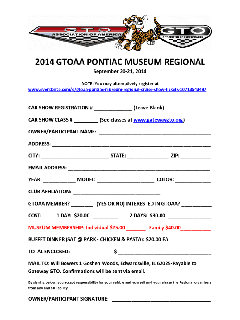 2014GTOAAPONTIACMUSEUMREGIONAL September2021,2014 NOTE:Youmayalternativelyregisterat www.eventbrite.com/e/gtoaapontiacmuseumregionalcruiseshowtickets10713543497 CARSHOWREGISTRATION# (Leaseback) CARSHOWCLASS#