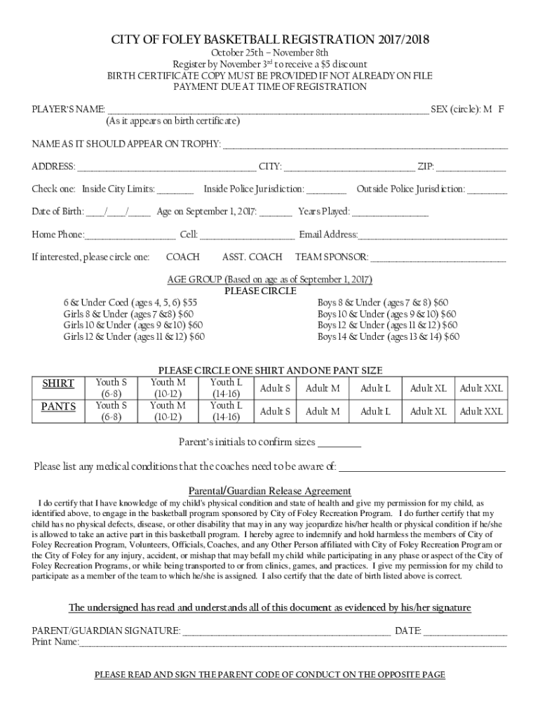 CITY OF FOLEY BASKETBALL REGISTRATION 2017/2018 October 25th November 8th Register by November 3rd to receive a $5 discount BIRTH CERTIFICATE COPY MUST BE PROVIDED IF NOT ALREADY ON FILE PAYMENT DUE