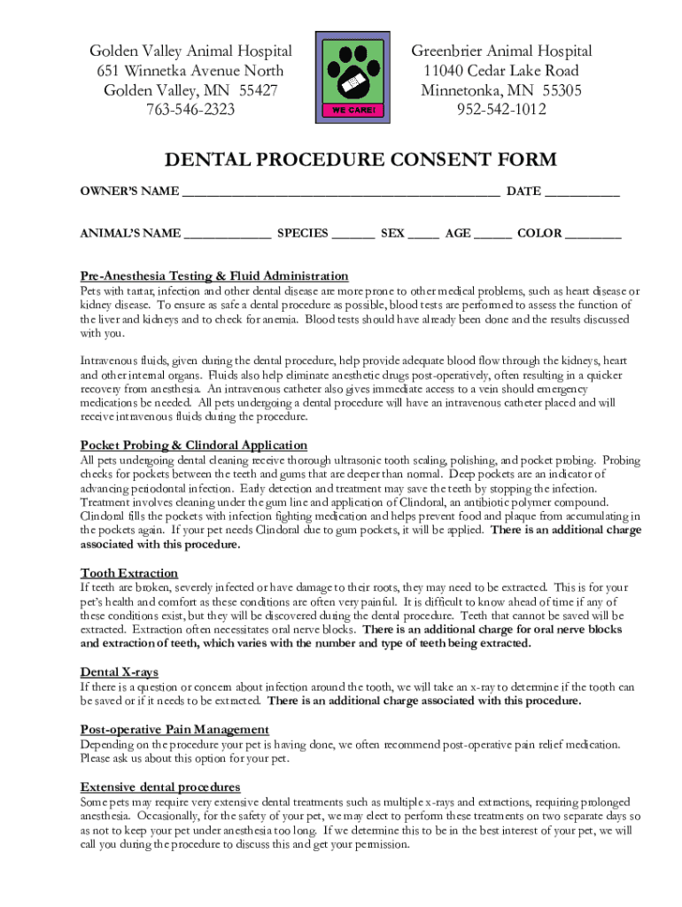 Golden Valley Animal Hospital 651 Winnetka Avenue North Golden Valley, MN 55427 7635462323Greenbrier Animal Hospital 11040 Cedar Lake Road Minnetonka, MN 55305 9525421012DENTAL PROCEDURE CONSENT FORM