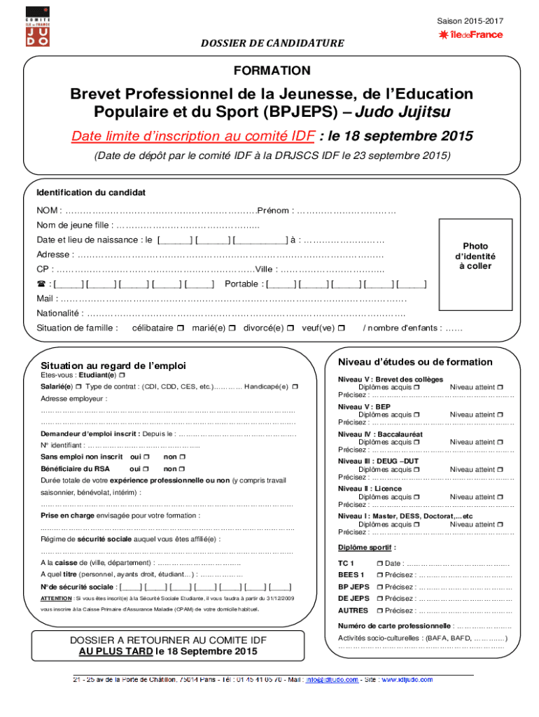 Saigon 20152017DOSSIER DE CANDIDATUREFORMATIONBrevet Professional de la Tennessee, DE education Popular et Du Sport (BPJEPS) Judo Jujitsu Date limited inscription AU comic IDF : LE 18 September 2015