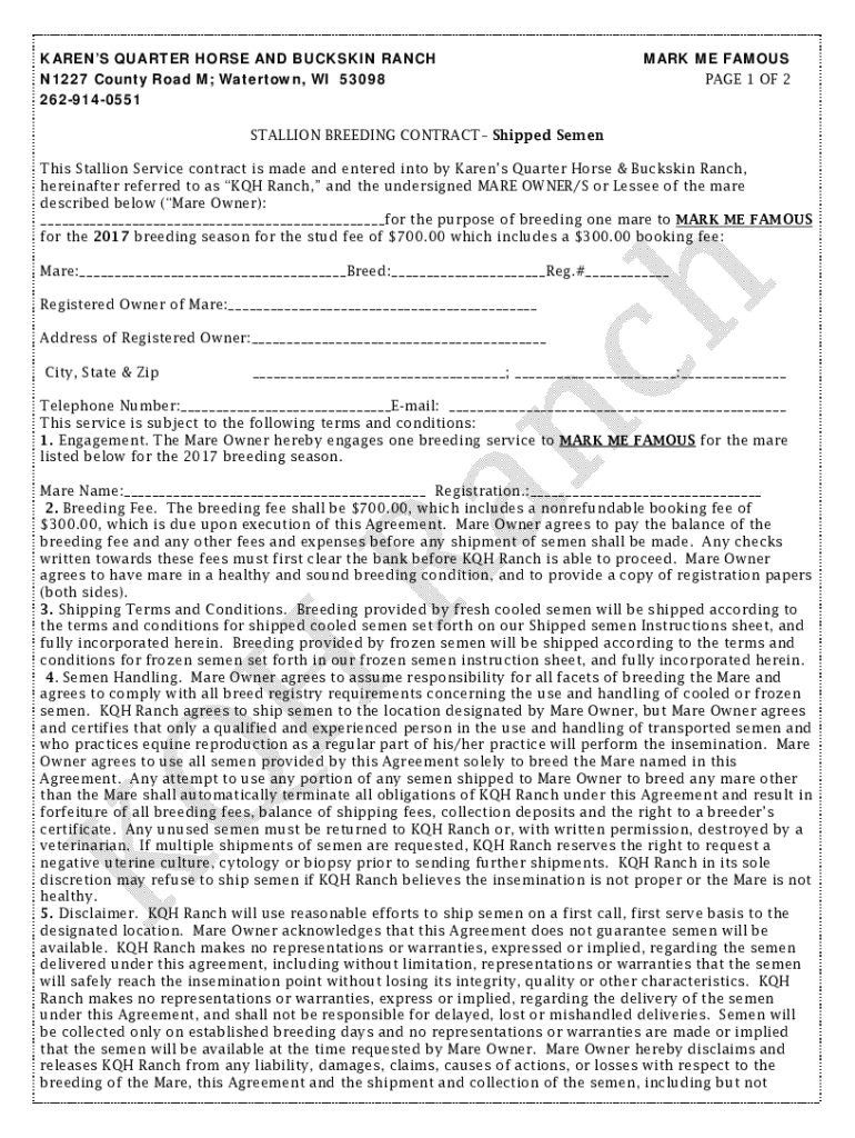 KAREN QUARTER HORSE AND BUCKSKIN RANCH N1227 County Road M; Watertown, WI 53098 2629140551MARK ME FAMOUS PAGE 1 OF 2STALLION BREEDING CONTRACT Shipped Semen This Stallion Service contract is made