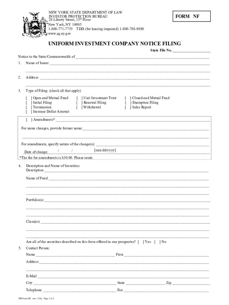 NEW YORK STATE DEPARTMENT OF LAW INVESTOR PROTECTION BUREAU 28 Liberty Street, 15th Floor New York, NY 10005 18007717755 TDD (for hearing impaired) 18007889898 www.ag.ny.govFORM NF InstructionsINVESTMENT
