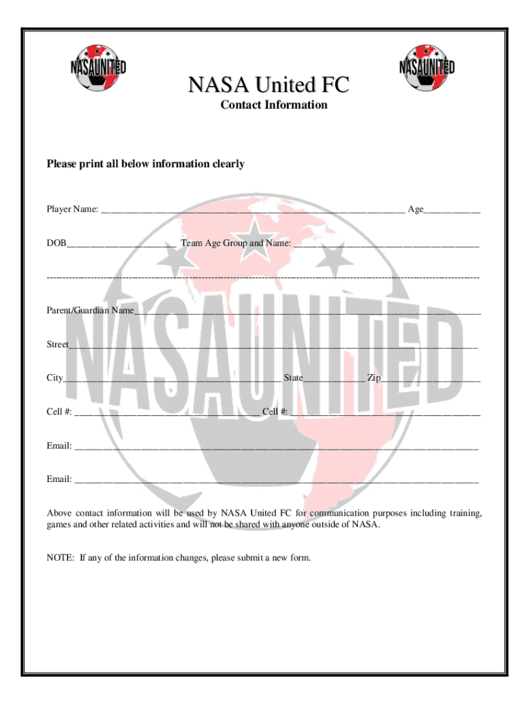 NASA United FC Contact InformationPlease print all below information clearlyPlayer Name: Age DOB Team Age Group and Name: Parent/Guardian Name Street City State Zip Cell #: Cell #: Email: Email: Above