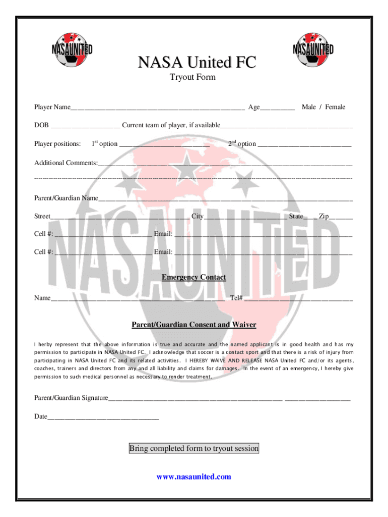 NASA United FC Tryout Form Player Name Age Male / Female DOB Current team of players, if available Player positions:1st option 2nd option Additional Comments: Parent/Guardian Name Street City State