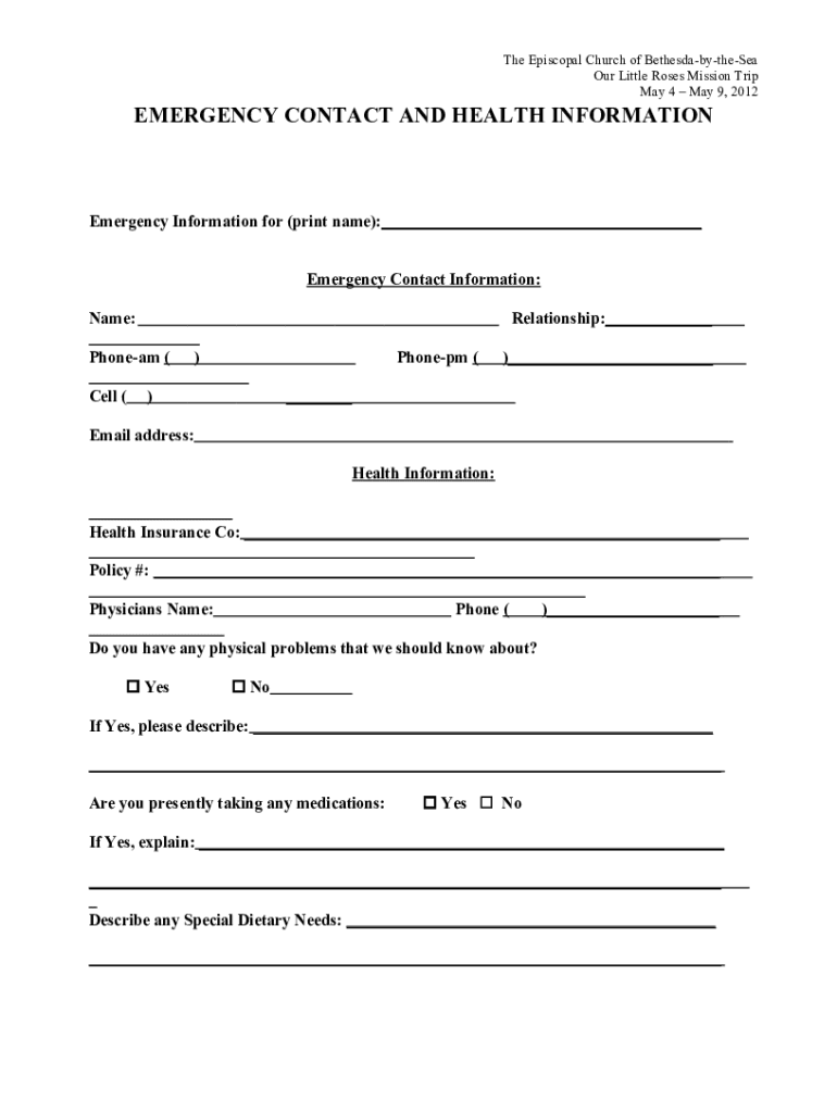 The Episcopal Church of BethesdabytheSea Our Little Roses Mission Trip May 4 May 9, 2012EMERGENCY CONTACT AND HEALTH INFORMATIONEmergency Information for (print name): Emergency Contact Information: