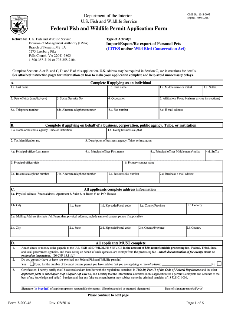 OMB No. 1018-0093 Expires 05/31/2017 Department of the Interior U.S. Fish and Wildlife Service Federal Fish and Wildlife Permit Application Form Return to: U.S. Fish and Wildlife Service Division