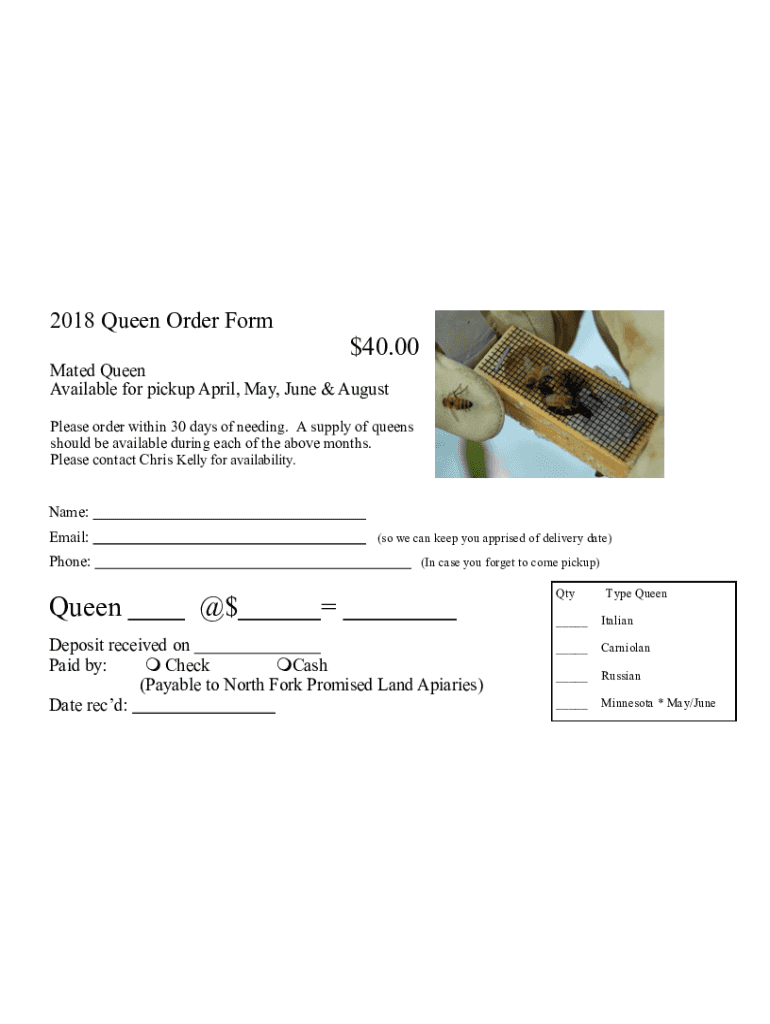 2018 Queen Order Form$40.00Mated Queen Available for pickup April, May, June & AugustPlease order within 30 days of needing. A supply of queens should be available during each of the above months.