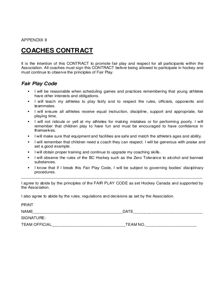 APPENDIX COACHES CONTRACT It is the intention of this CONTRACT to promote fair play and respect for all participants within the Association. All coaches must sign this CONTRACT before being allowed