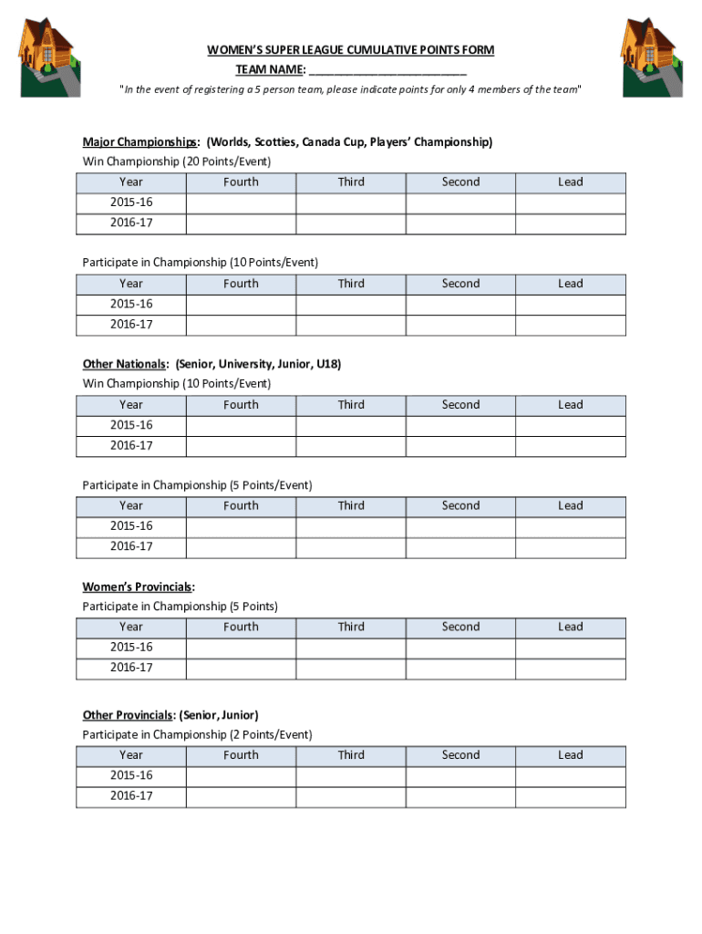 WOMEN SUPER LEAGUE CUMULATIVE POINTS FORM TEAM NAME: “In the event of registering a 5-person team, please indicate points for only 4 members of the team “Major Championships: (Worlds, Scotties,
