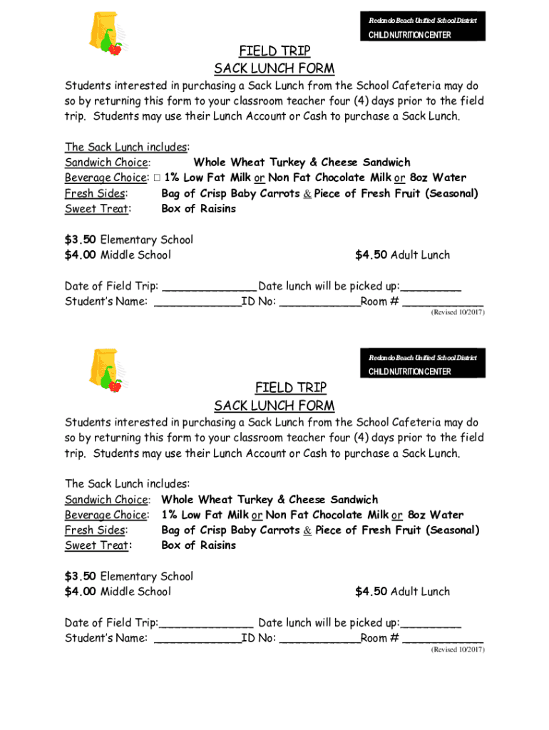Redondo Beach Unified School DistrictCHILD NUTRITION CHESTERFIELD TRIP SACK LUNCH FORM Students interested in purchasing a Sack Lunch from the School Cafeteria may do so by returning this form to