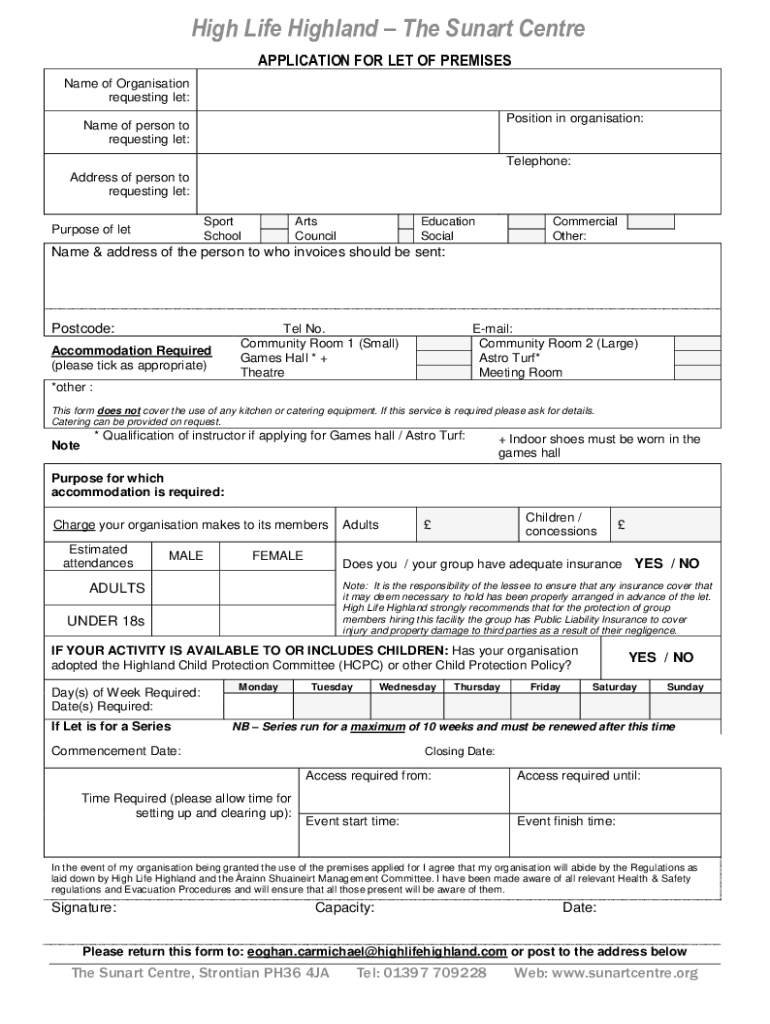 High Life Highland The Sun art Center APPLICATION FOR LET OF PREMISES Name of Organization requesting let: Position in organization:Name of person to requesting let:Telephone: Address of person to