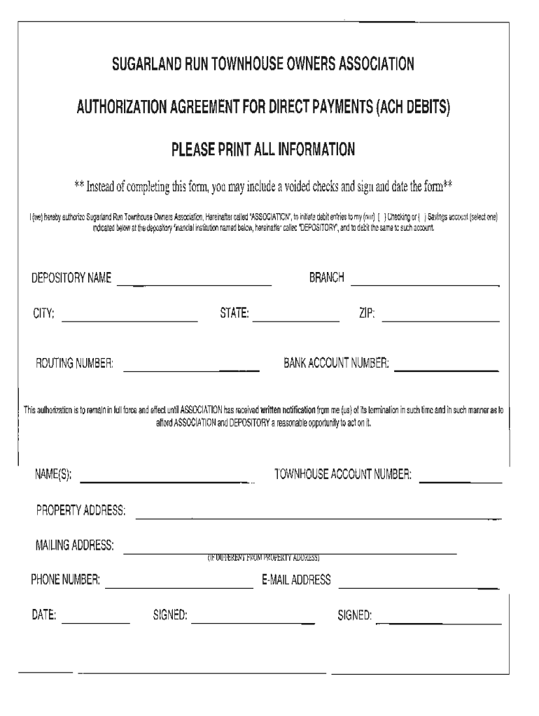 GARLAND RUN TOWNHOUSE OWNERS ASSOCIATION AUTHORIZATION AGREEMENT FOR DIRECT PAYMENTS (ACH DEBITS) PLEASE PRINT ALL INFORMATION ** Instead of completing this form you may include a voided check and