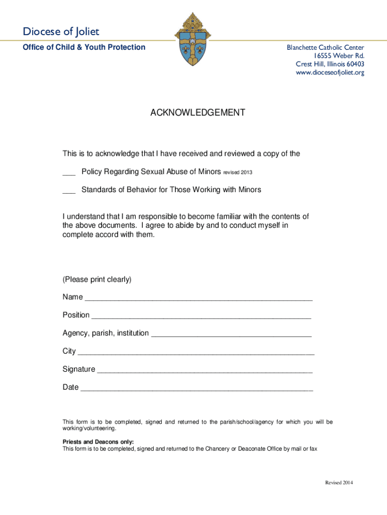 Get the free Diocese of Joliet Child Protection Acknowledgment Form