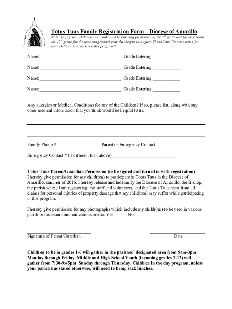 Titus Thus Family Registration FormDiocese of AmarilloNote: To register, children and youth must be entering (at minimum) the 1st grade and (at maximum) the 12th grade for the upcoming school year