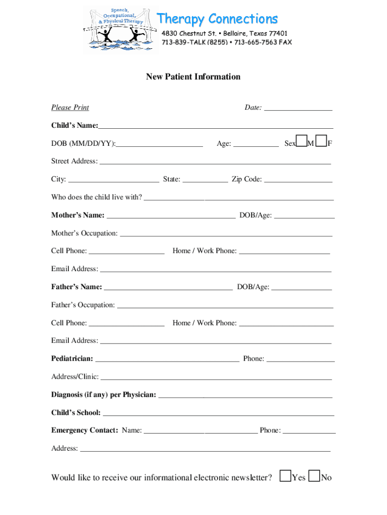 Therapy Connections 4830 Chestnut St. Bella ire, Texas 77401 713839TALK (8255) 7136657563 Anew Patient InformationPlease Private: Child's Name: DOB (MM/DD/BY): Age: Sex:Street Address: City: State: