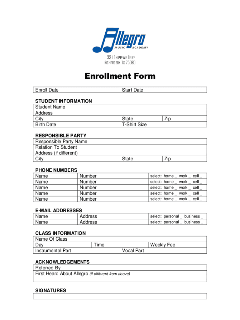 Enroll Date Start DateSTUDENT INFORMATION Student Name Address City Birth Intestate Shirt SizeZipRESPONSIBLE PARTY Responsible Party Name Relation To Student Address (if different) CityStateZipPHONE