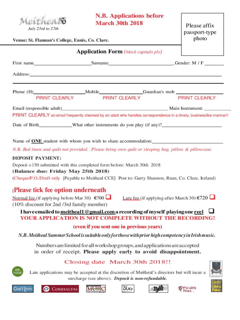 N.B. Applications before March 30th 2018Please affix passport type photoJuly 23rd to 27thVenue: St. Flannels College, Tennis, Co. Clare. Application Form (block capitals pls) First nameSurname Gender: