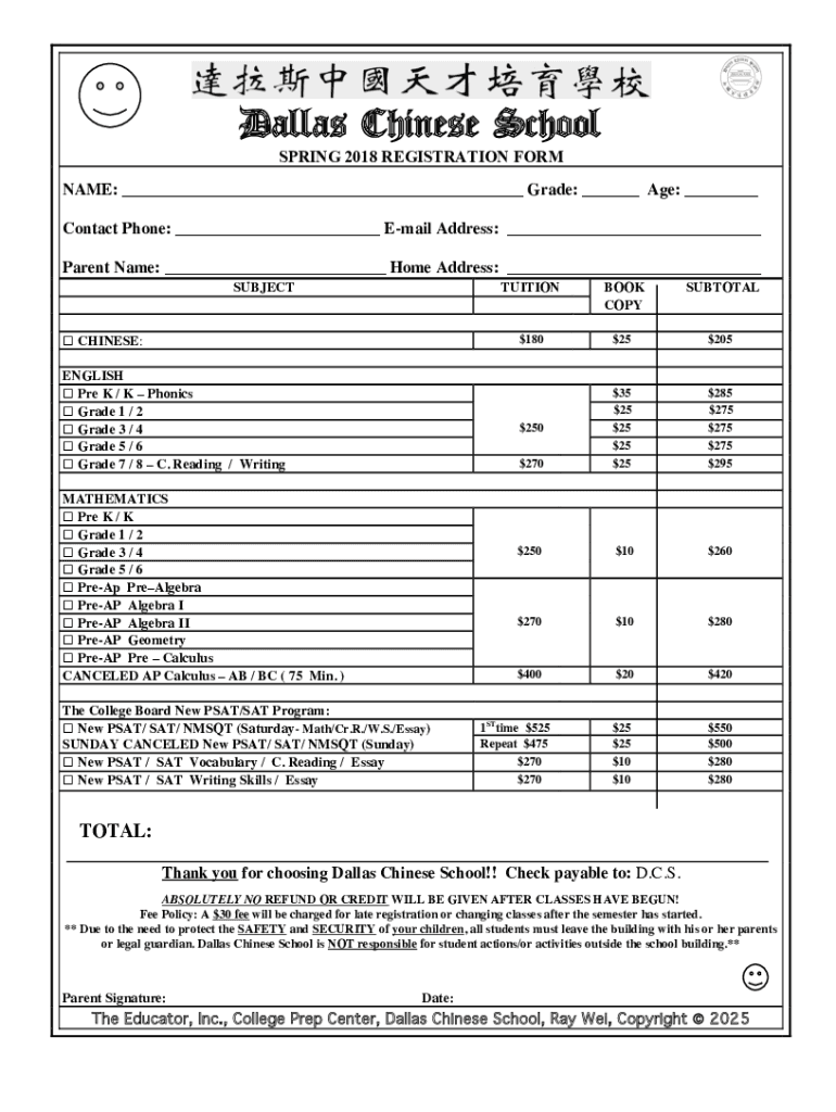 Dallas Chinese School SPRING 2018 REGISTRATION FORM NAME: Grade: Age: Contact Phone: Email Address: Parent Name: Home Address: SUBJECT CHINESE: ENGLISH PRE K / K Phonics Grade 1 / 2 Grade 3 / 4 Grade